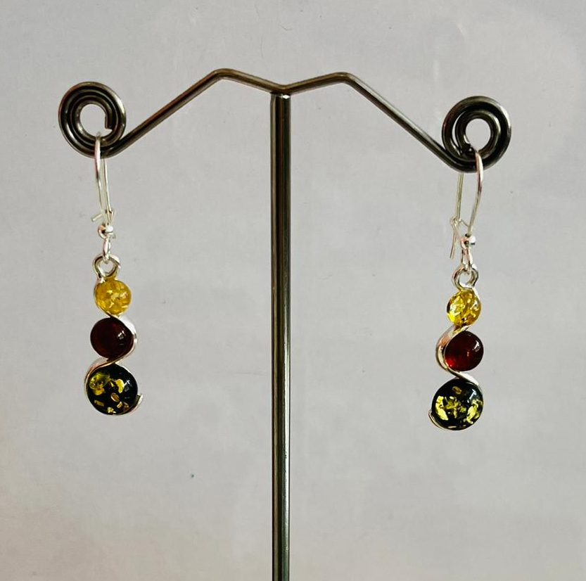 Aros ámbar tricolor colgantes, con ámbar en tonos verde, coñac y miel con plata 925