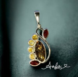 Hermoso colgante de ámbar y plata italiana 925 en forma de llave de sol.