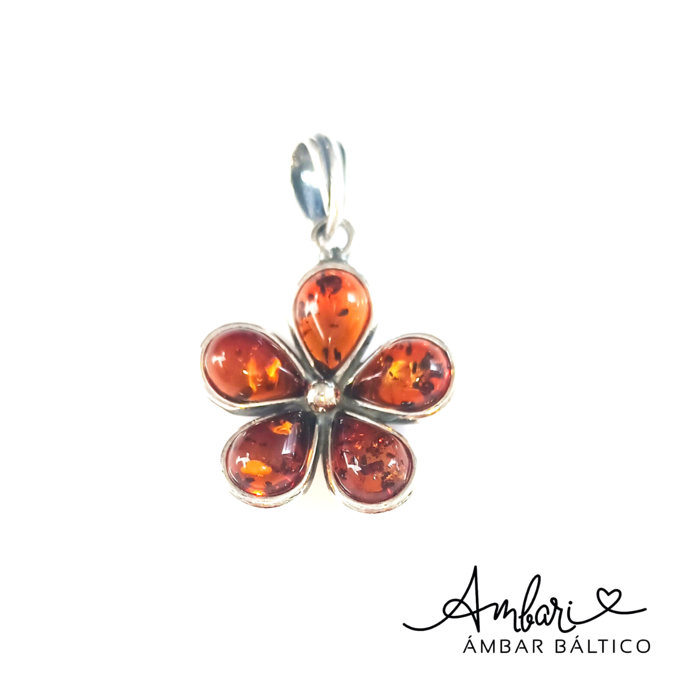 Colgante de Ámbar Flor Grande Coñac y Plata 925